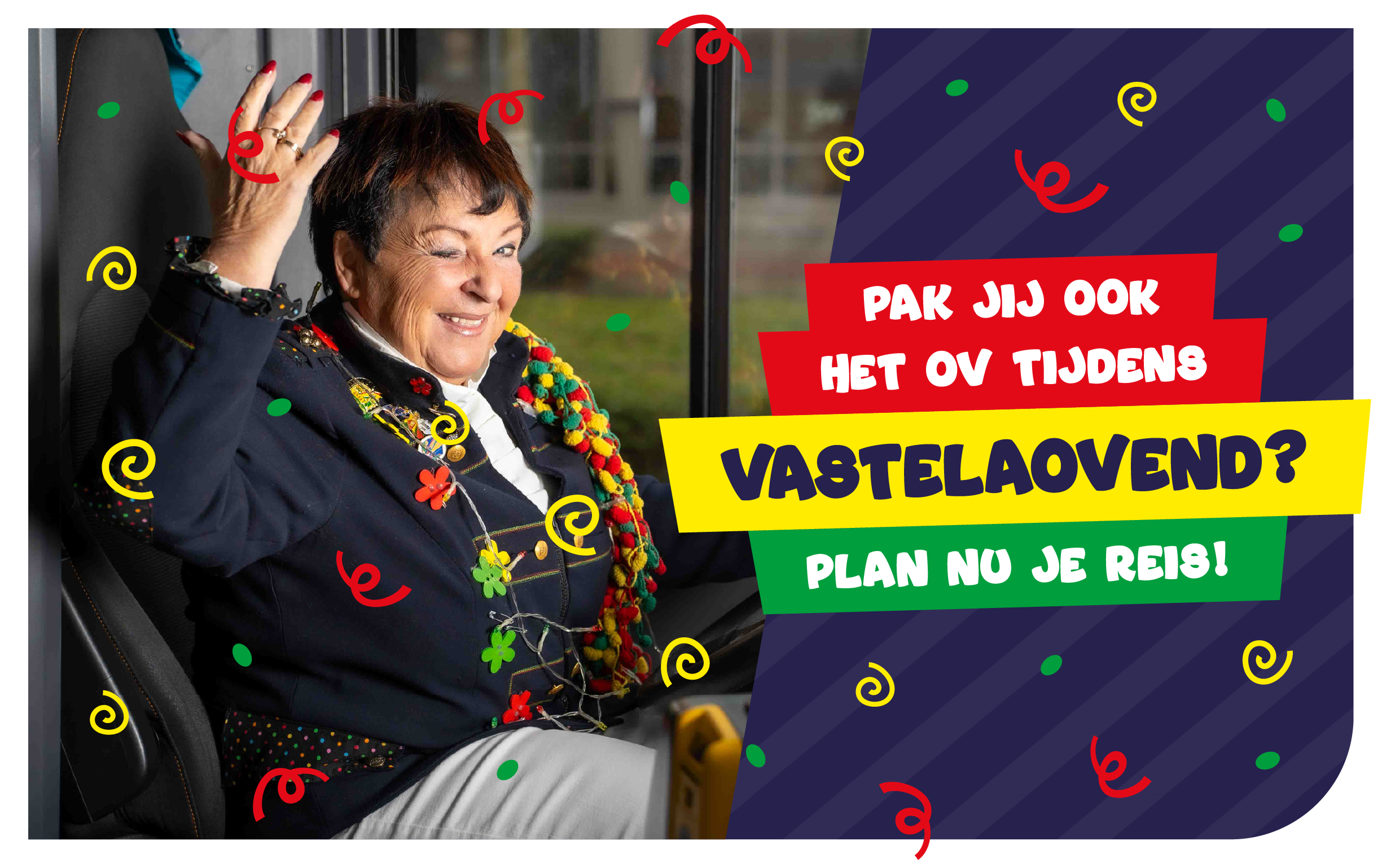 Tijdens de Vastelaovend rijden treinen en bussen volgens een andere dienstregeling. Ook kan het voorkomen dat in verband met diverse optochten de bussen aangepaste routes moeten rijden. Dit kan zorgen voor vertragingen of langere reistijden. Check altijd de reisplanner voor vertrek.