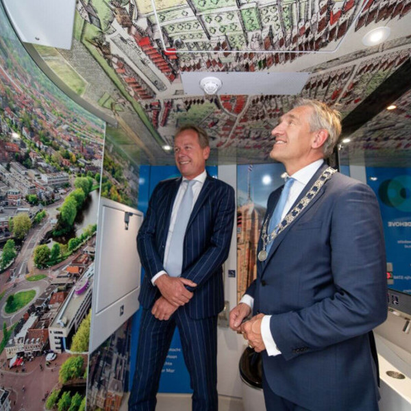 Stap ook in met een dagkaartHistorisch Centrum Leeuwarden (onderdeel van Gemeente Leeuwarden) en Arriva verzamelden de mooiste foto’s en een stukje geschiedenis waardoor de reizigers in de coupé bijna letterlijk aan de voet van de Oldehove staan.