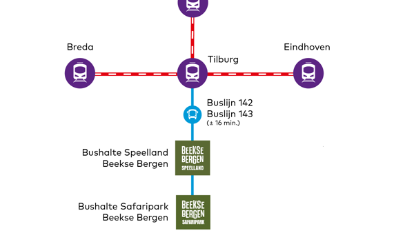 Reis met de trein naar station Tilburg. Neem vanaf station Tilburg buslijn 142 richting Best of buslijn 143 richting Reusel en stap uit bij halte Safaripark.