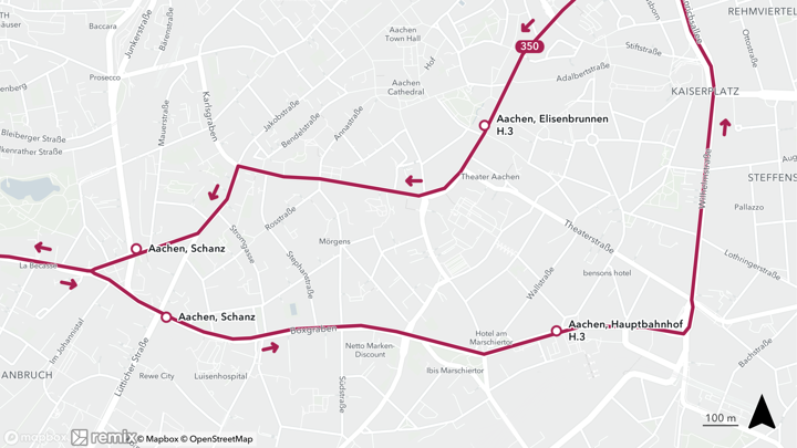 Vanwege de grootschalige werkzaamheden (begin 2025) in de Theaterstraße rijdt lijn 350 vanaf zaterdag 7 december 2024 een andere route in Aachen. De bussen van lijn 350 stoppen daardoor tot nader bericht niet op het Bushof (busstation) van Aachen.